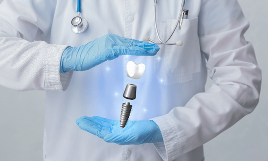 インプラントとは、失った歯を補うために、顎の骨に人工の歯根を埋め込む治療法です。歯の根にあたるインプラント体、その上に被せる人工歯、両者をつなぐアバットメントの3つの部品から構成されています。